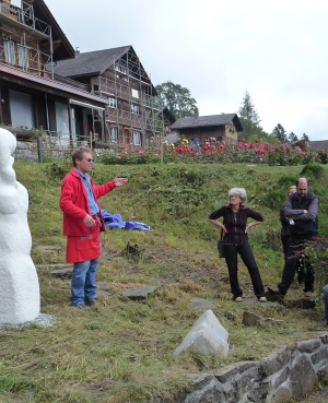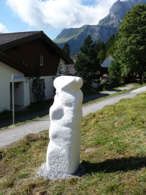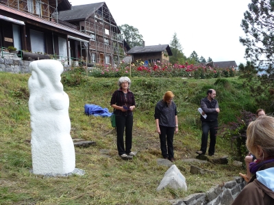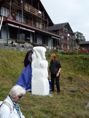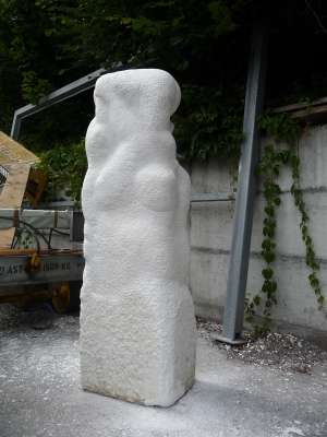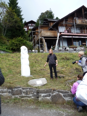 Dieser betörend schöne Riesenstein ist „Consuela“ geworden, eine pulverschneeweisse Marmormama mit Kind. Der Standort erfüllt die kühnsten Träume mit Blick auf die Berggipfel mit ewigem Schnee.